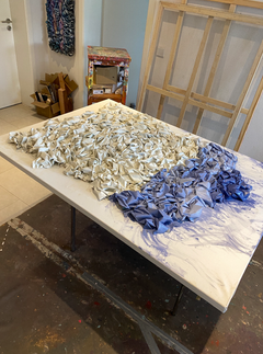 I can spend the whole day like this, forget to eat, and only when I feel that my back is tired or my eyes start to close, I can finish. I see the news in the German and French newspapers that my friends and relatives bring me. I am especially fascinated by the heading "memory" where the names of the dead are published with their dates of life. In Moscow, in a big city (14 million people), when you die, only those closest to you remember you, right there in a small city in Germany (I live in St.Ingbert 40 000 people), everything is much more personal. This is how I begin to think about existence and life. Then I come across a headline about the bombing of Ukraine and I return to my gloom. And so on and so on. This is the process in which I paint over these news for my final artwork, these events have given me material for thought and spending time with. Living life, minutes captured in folded waves of news events. I often listen to lectures, books and interviews while I work. After the work is "assembled" I leave it for a few days to dry.