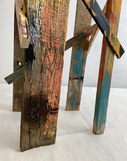 Tower, 2022, recycled wood, paper, plastic; paint, spray paint, screws, plaster, 202 x 60 x 55 cm.