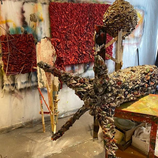 Sacrarium, 2022, recycled wood, paper, cardboard, rope; paint, polyurethane foam, plaster, 155 x 57 x 45 cm.