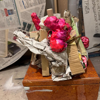 These actions arose completely unconsciously. Just like the black colour, when working with newspapers, it wanted to go outside. And here, too, something is scratching in my chest and demands an outlet. I know what it is. It's an unresolved situation with my parents and their support for the war. I can't accept it and it constantly bothers me.
