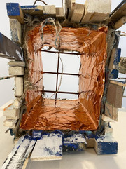 I made the first draft of this work in July 2022. Since then, this beginning has been hanging out in my studio. Changing the place from prominent to hidden. The first iron grating solution with a square box was so good that I think that's what stopped me. I couldn't find a solution on how to maintain this communication between objects without destroying it.