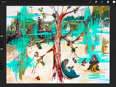I needed to develop work for the living room. My task was to connect two canvases to match the requested size and it would be easy to transport. As I mentioned earlier, the best thing an artist can work for is a viewer. This work was intended for the Russian-German family. My ideas began to revolve around Russian culture and the place where Collector lives. In this small town is the Apple Tree Plantation. I often walk there with a dog.