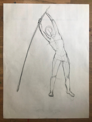 Relative to the main axis: In several sketches with a stick, I managed to convey the centerline, but the centre of gravity was always shifted between the stick and the figure, so it was difficult to determine it.